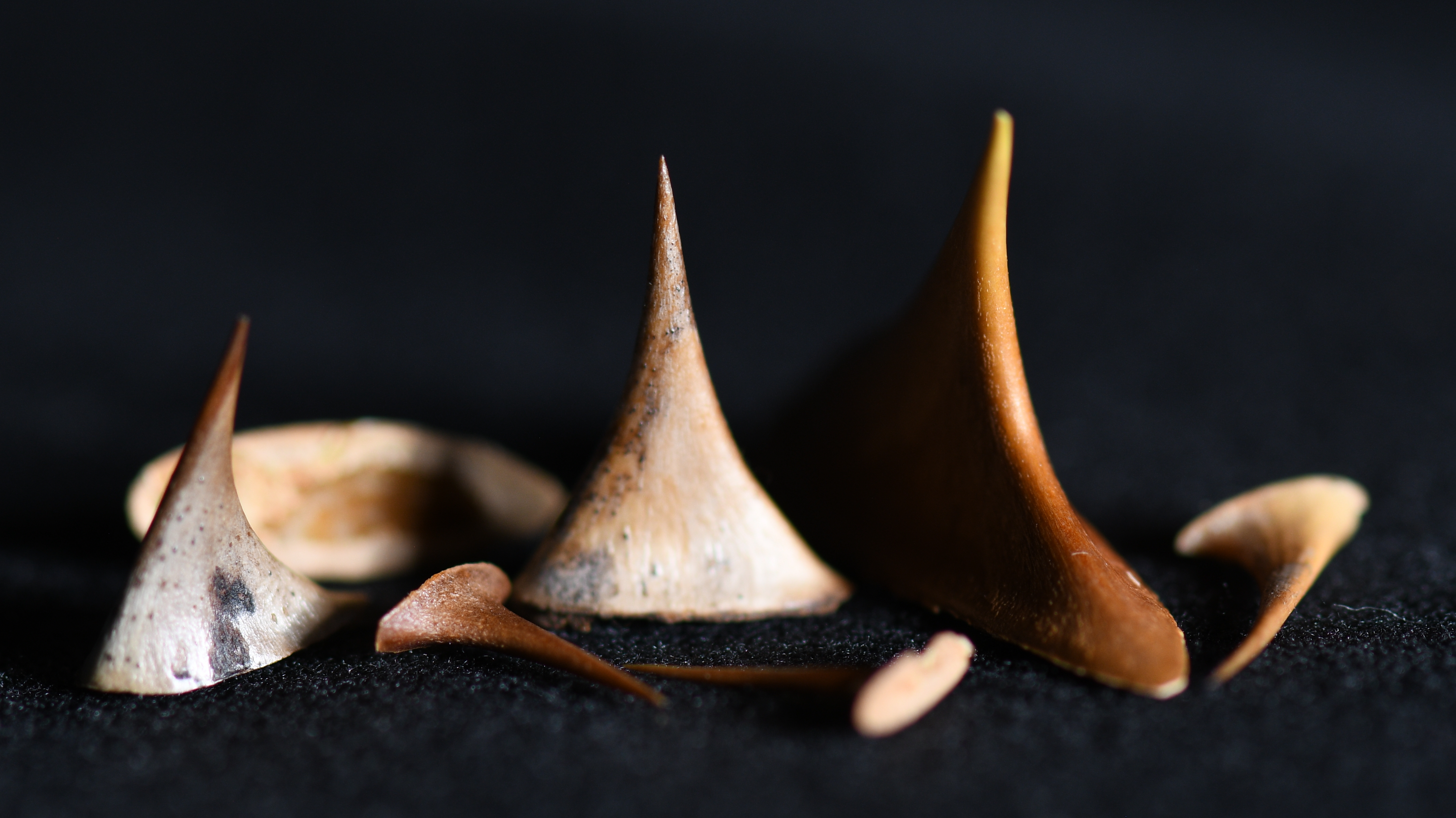 Coming from fluid mechanics, this was not the first time we encountered parabolic tip shapes in the literature. For example, the tip of icicles which are shaped by the physics of melting[2], the apex of a cylinder of sugar melting in a tank of water shaped by flow driven by dissolution[3], are both paraboloid. What if the stingers are also shaped by some erosive mechanism, where material is removed rather than added? To verify this notion, we decided to look for newly formed stingers. Unsurprisingly perhaps, finding well preserved stingers that have never been used turned out to be quite the ordeal. Fortunately, around the same time Ryderheim et al. (PNAS 2024)[4] published images of the microscopic mandibles of larval copepods – of pristine, unused marine ‘teeth’ and those of used mandibles later in their lifetime. These newly minted stinger tips were sharp “spinose” cones, whereas the used stingers were reminiscent of the universal parabolic geometry. This observation affirmed our hypothesis that the universality of stinger shapes stem not from a biological driver, rather, it is simply geometry and mechanics at play.